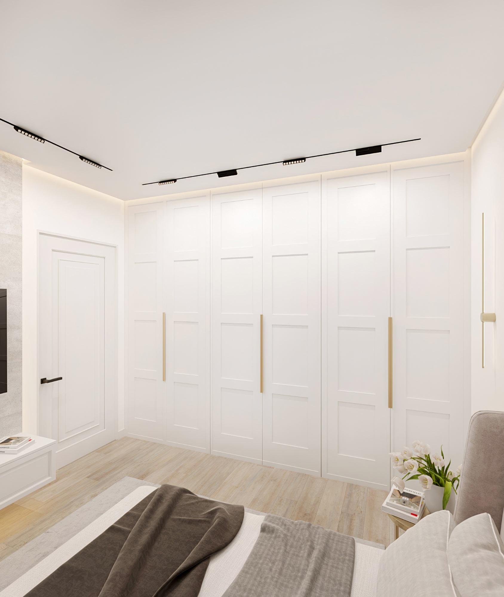 Спальня получилась светлой и просторной: здесь организована зона с макияжным столом, а гардеробная разграничена от спальни не перегородками, а фасадами мебели, что сохраняет целостность интерьера.